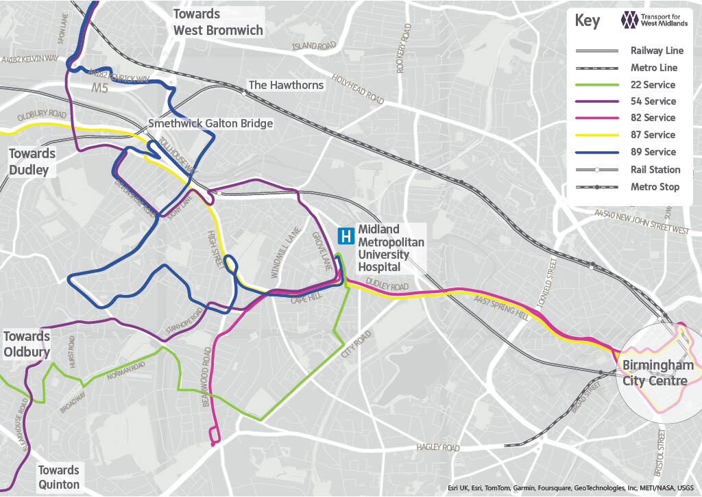 We have partnered with Transport for West Midlands to establish a number of dedicated service routes and route changes to help everyone reach the Midland Metropolitan University Hospital.